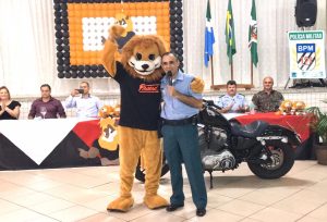 O mascote do PROERD, o leão Daren, que representa a garra, a força e a resistência que as crianças precisam para dizer não às drogas, chegou à festa de formatura.