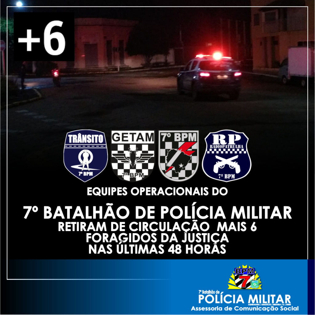 Pensando no bem da comunidade, equipes do 7º Batalhão de Polícia Militar em apenas 48 horas retiram de circulação, mais 6 (seis) foragidos da justiça.
