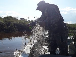 Outra equipe da PMA de Dourados, que realizava patrulhamento fluvial no Rio Brilhante, ao passar gancho em sistema de arrastão no leito do rio localizou e recolheu uma rede de pesca de 30 metros. Esse uso de gancho é usado comumente nas fiscalizações para a localização desses petrechos ilegais, tendo em vista que alguns infratores armam as redes e espinhéis e afundam as pontas para que não fiquem à vista, para esconder da fiscalização e também de outros pescadores que podem retirar peixes capturados em seus petrechos.