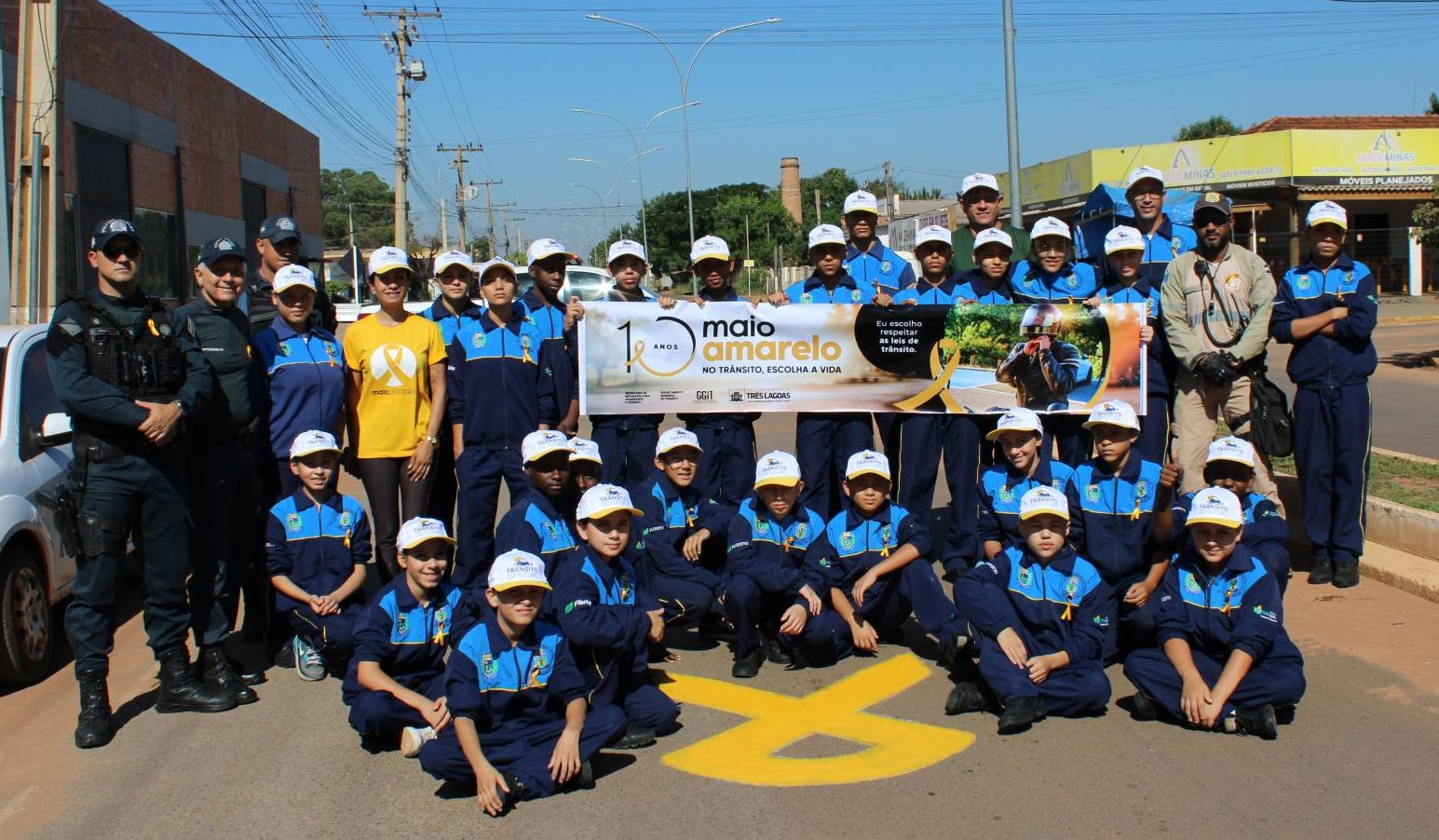 Três Lagoas – MS, no dia 5 de maio, os policiais militares do Pelotão de Trânsito do 2º Batalhão de Polícia Militar, Patrulha Mirim da Polícia Militar e Departamento Municipal de Trânsito de Três Lagoa, realizaram ação simbólica e temática em