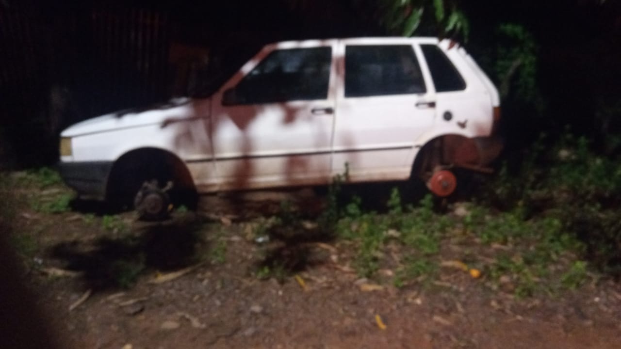 Campo Grande (MS), na madrugada de ontem (21/11), a guarnição PM foi acionada para averiguação de um veículo abandonado em via pública no Jardim Pênfigo. No local, foi encontrado o veiculo UNO cor branca, estava sem as 4 rodas, sem bateria e sem o pneu