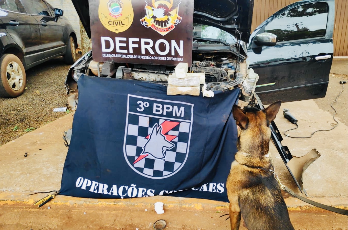 Dourados(MS) Policiais militares do Grupo de Operações com Cães (GOC) apoiaram uma equipe da Delegacia Especializa em Crimes de Fronteira (DEFRON), na apreensão de quase 15 quilos de cocaína. Os policiais juntamente com os cães farejadores Mago e