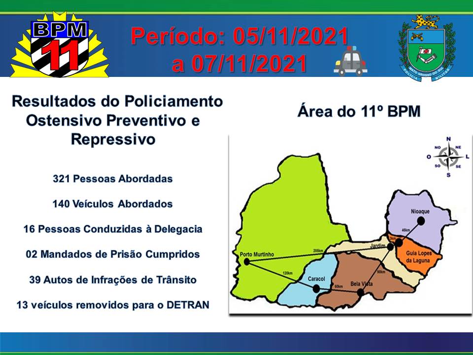 Jardim (MS) – Na manhã desta segunda-feira (08/11) o Comandante do 11º BPM, tenente-coronel Velasques, divulgou os resultados das ações do policiamento ostensivo preventivo e repressivo realizadas neste final de semana, dentro da circunscrição