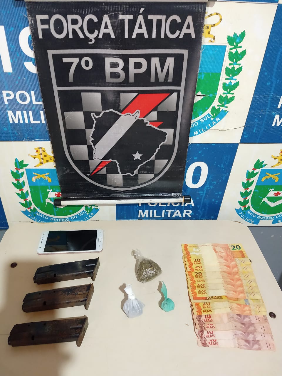 Aquidauana (MS) – Durante cumprimento de mandado de prisão, Força Tática de Aquidauana encontra carregadores de pistola e porções de maconha. Às 10:20h de ontem, 08/07, a equipe em destaque foi solicitada para prestar apoio à uma equipe de Policiais