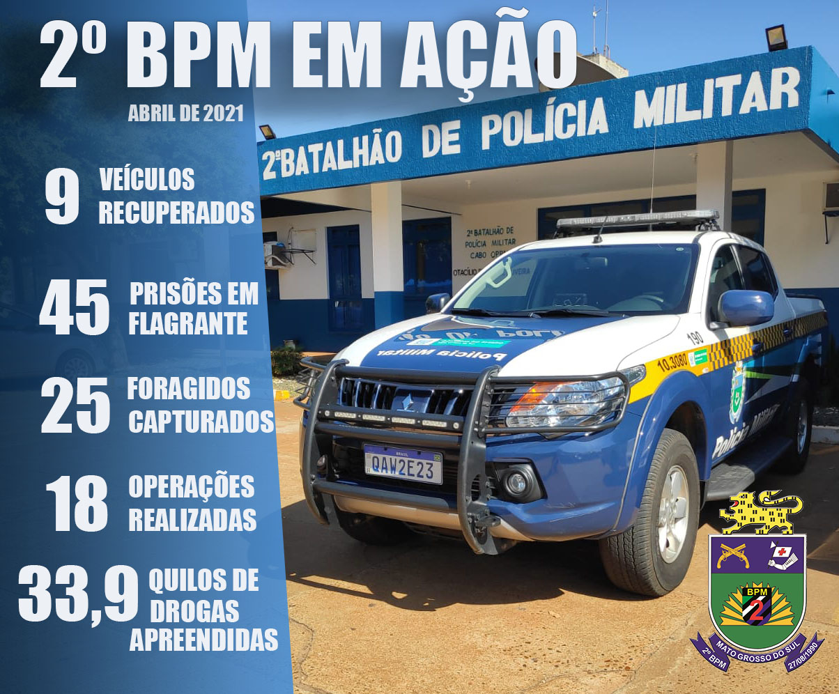 No mês de abril na área de atuação do 2º Batalhão de Polícia Militar que compreende os municípios de Brasilândia, Selvíria, Água Clara e Arapuá foi realizado: 25 cumprimentos de mandados de prisões; 18 operações policiais; 9 veículos