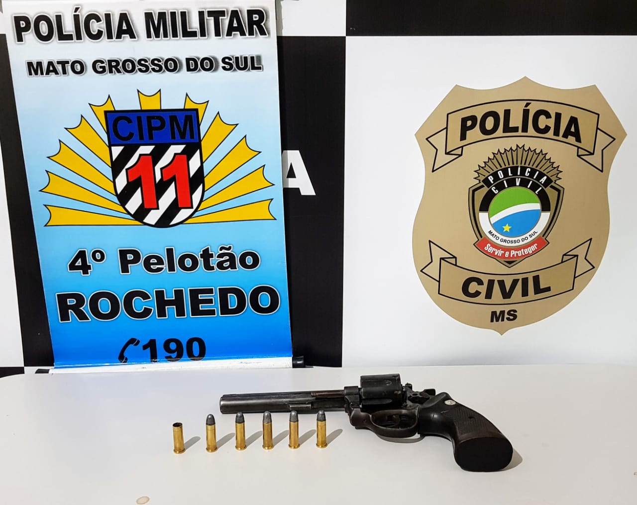 Rochedo (MS) – Policiais Militares do Pelotão de Rochedo da 11ª Companhia Independente de Polícia Militar em ação conjunta com a Polícia Civil de Rochedo, prenderam na noite deste sábado (27/02), indivíduo com revólver e munições na área