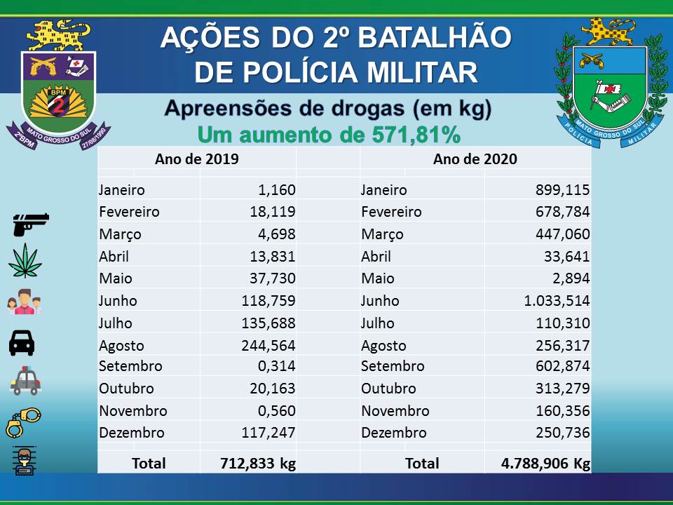 TRÊS LAGOAS (MS) – Nesta segunda-feira (04) o 2º Batalhão de Polícia Militar (2º BPM) divulgou os dados estatísticos das ações desenvolvidas no ano de 2020 com destaque para quase 05 toneladas de drogas apreendidas. Um aumento de 571,81% em
