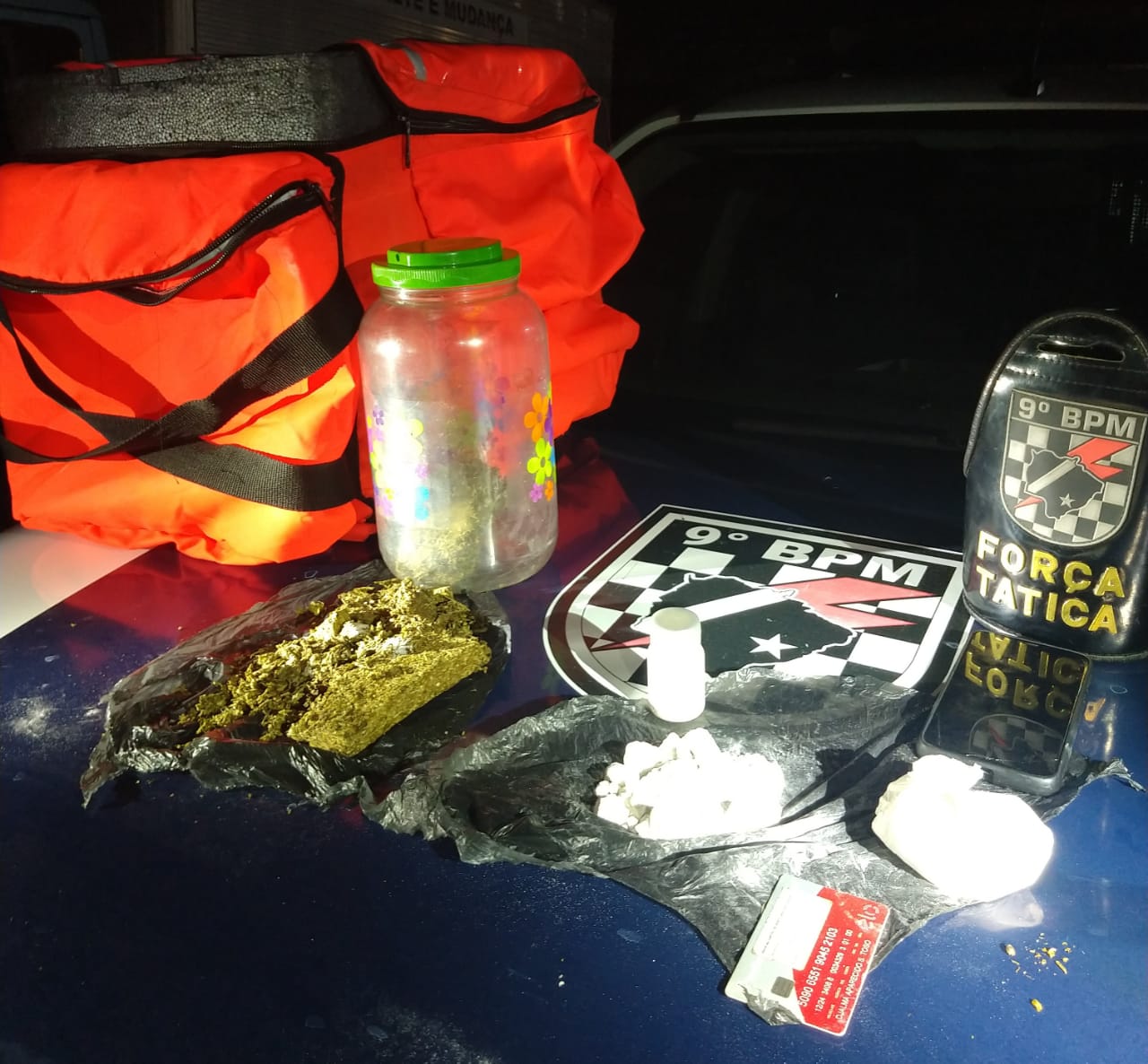 A equipe Força Tática do 9º Batalhão de Polícia Militar em rondas preventivas pelo bairro Mata do Jacinto, na data do dia 12 de outubro por volta das 17:00 horas, avistou um indivíduo em atitude suspeita com uma caixa de entrega nas costas. Diante da