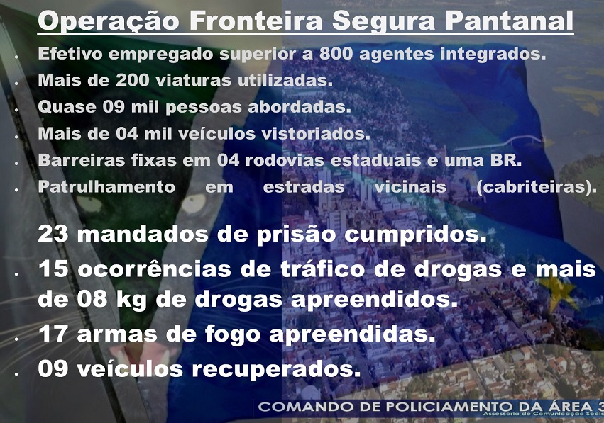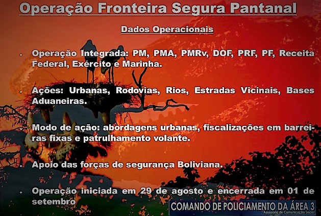 Aquidauana (MS) – Conforme noticiado anteriormente, neste domingo (01) houve o encerramento da “Operação Fronteira Segura Pantanal”. Esta operação foi coordenada pelo GGIFron-Div (Gabinete de Gestão Integrada de Fronteiras e Divisas)