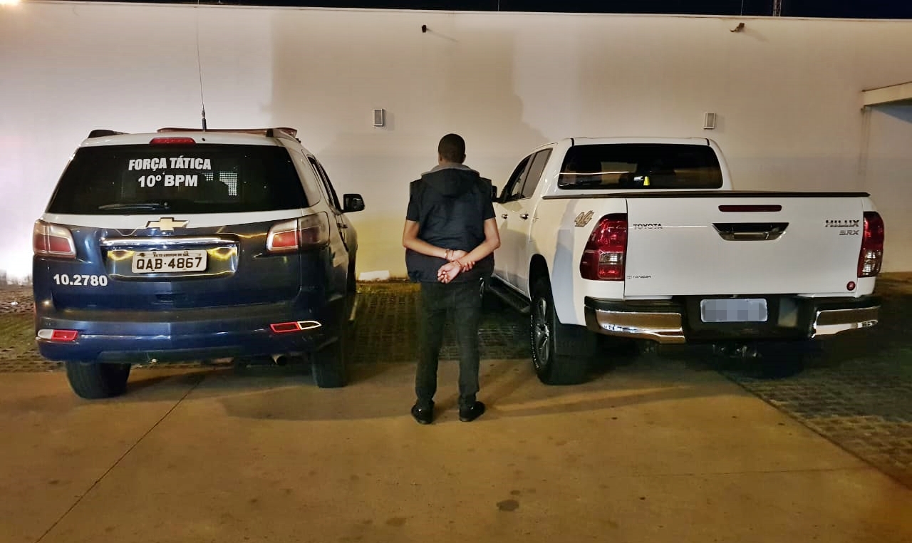 Campo Grande (MS) – Na madrugada desta quinta-feira (12), uma equipe da Força Tática do 10º Batalhão de Polícia Militar prendeu um homem de 25 anos que estava em posse de uma camionete Hilux, de cor branca, ano 2016, que constava nos registros de
