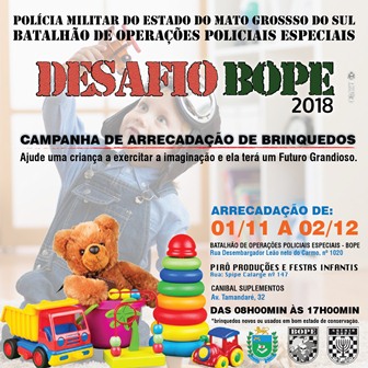 Campo Grande(MS) – A Polícia Militar de Mato Grosso do Sul por meio do seu Batalhão de Polícia Militar de Operações Policiais Especiais está participando de uma campanha de arrecadação de brinquedos que beneficiará crianças carentes. A
