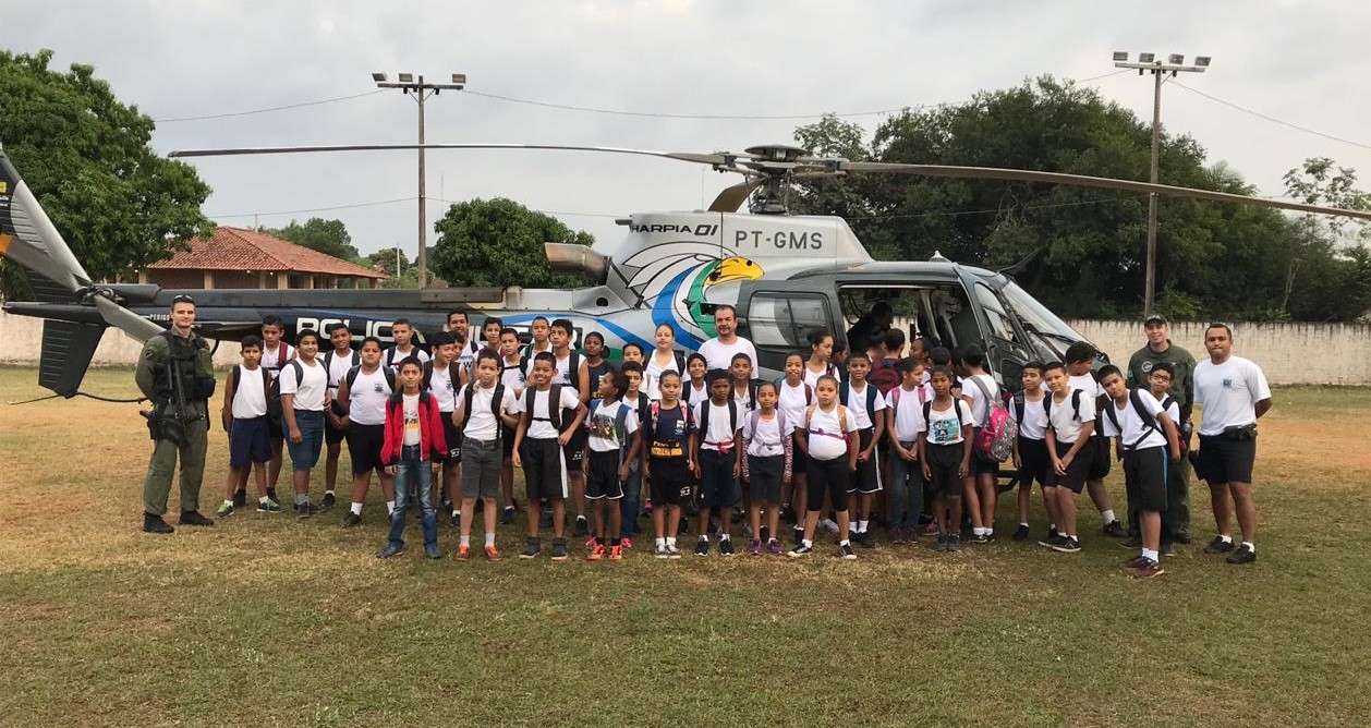 Aquidauana (MS) – Na última semana, as crianças do Projeto Patrulha Mirim do 7º Batalhão de Polícia Militar em Aquidauana recebem a visita de integrantes do Grupo de Patrulhamento Aéreo/GPA da Polícia Militar de Mato Grosso do Sul. O encontro