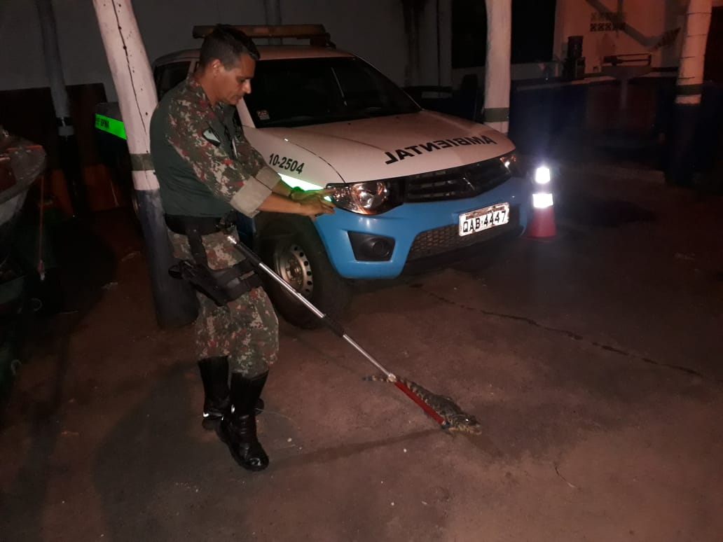 Campo Grande (MS) – Policiais Militares Ambientais de Miranda realizaram a captura de um jacaré no centro da cidade. Uma moradora (49) da rua General Câmara acionou a PMA ontem (13) à noite, informando que o animal estava transitando no meio da rua