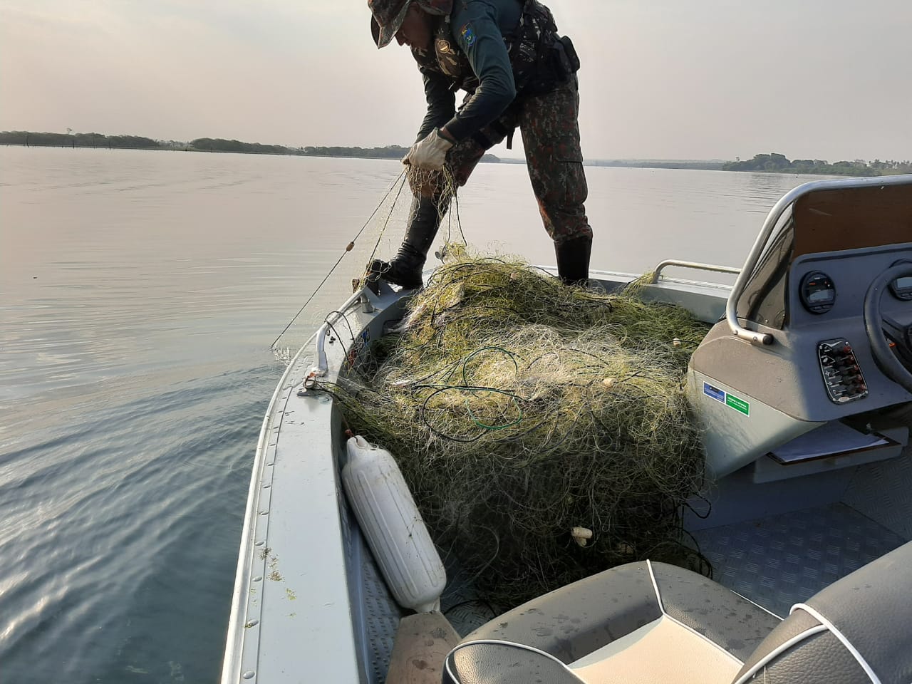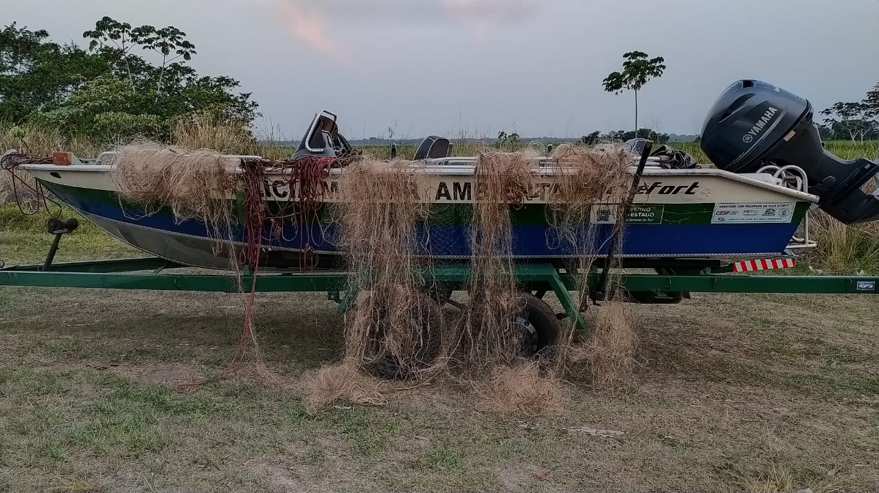 Campo Grande (MS) – Policiais Militares Ambientais de MS e Policiais Militares Ambientais da Força Verde (PR) realizavam fiscalização ambiental conjunta pela Operação Hórus, no rio Ivinhema, na região próxima da divisa de Estado, no município de
