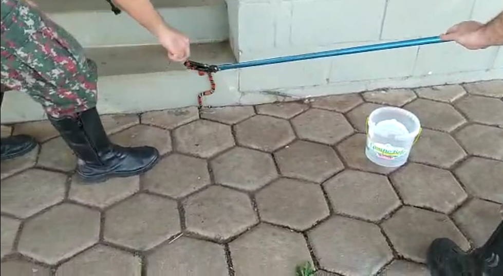 Campo Grande (MS) – Policiais Militares Ambientais de Três receberam uma chamada telefônica de funcionários de uma fábrica de calçados, informando sobre uma serpente que aparentava ser peçonhenta e estaria em uma escadaria por onde passam os