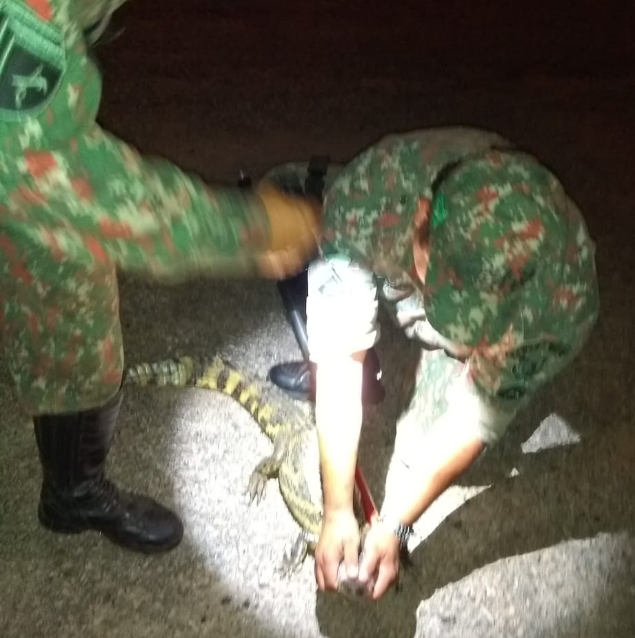 Policiais Militares Ambientais de Miranda realizaram a captura de um jacaré de 1,5 metros no perímetro urbano da cidade. Os moradores do Conjunto Habitacional Previsul acionaram ontem (14) às 22h00 a PMA, informando que o animal estava transitando no