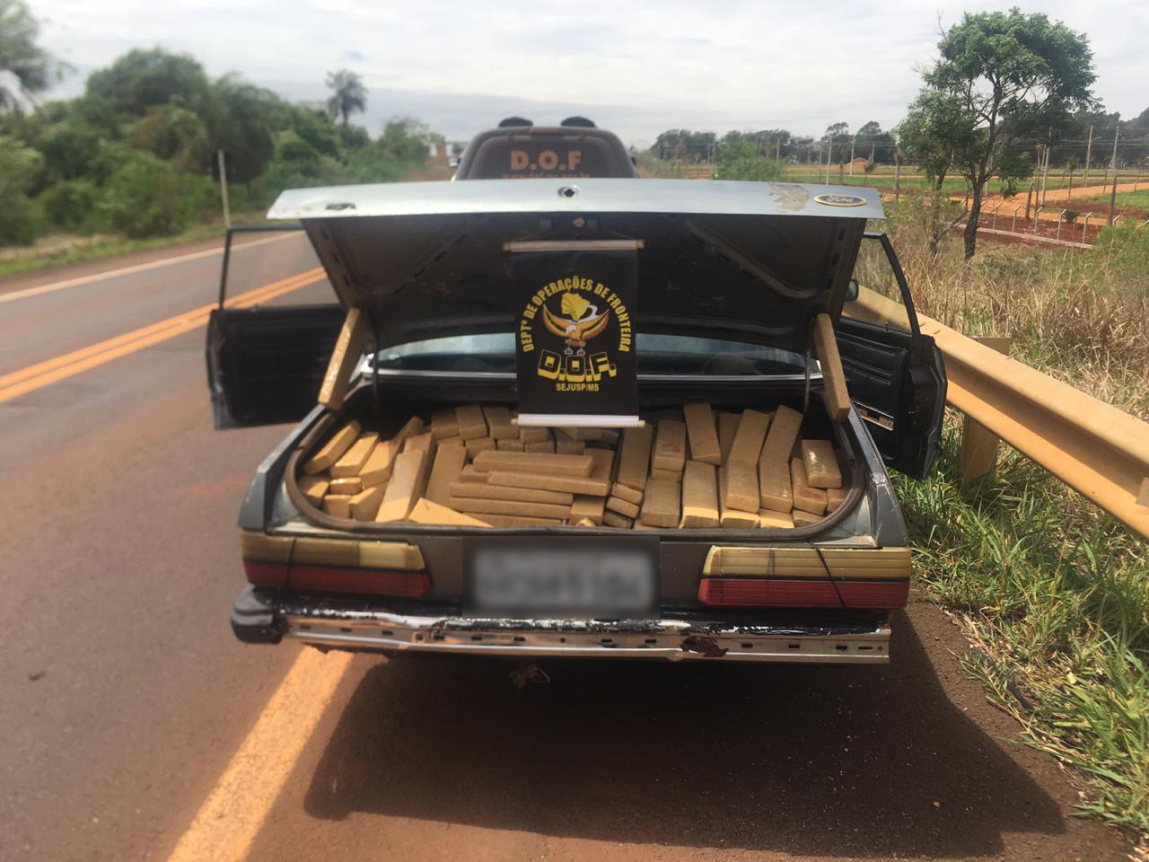 Dourados, 7 de outubro – Policiais do Departamento de Operações de Fronteira (DOF) apreenderam, na manhã de hoje (segunda-feira), um veículo Ford Del Rey carregado com vários volumes prensados de uma substância entorpecente, aparentemente maconha, com