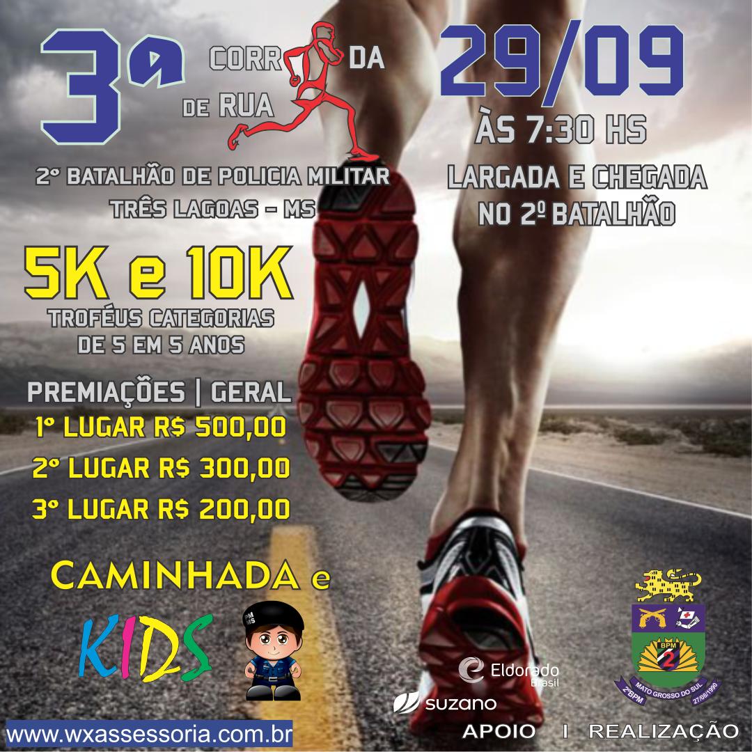 A 3ª Corrida de Rua do 2º Batalhão de Polícia Militar será realizada no dia 29 de setembro de 2019 no Município de Três Lagoas – MS com largada e chegada diante à Sede do 2º Batalhão, na Rua Manoel de Oliveira Gomes n°250 bairro Santa Terezinha.