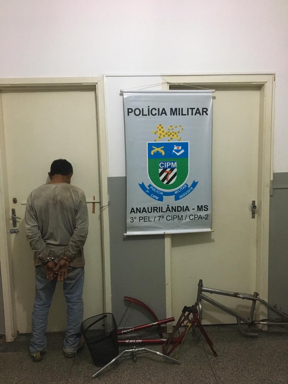 Anaurilândia (MS) – Por volta das 18 horas do dia 06/08, a guarnição da Polícia Militar em Anaurilândia prendeu um homem de 51 anos, após localizarem peças de uma bicicleta furtada no quintal da casa dele no centro da cidade. A Equipe realizava