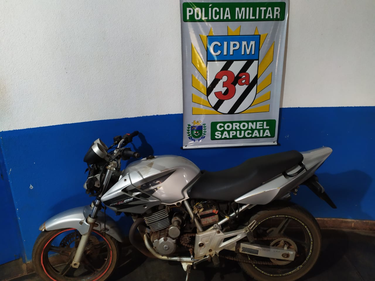 3ª CIPM Amambai – Na tarde desta quinta-feira (18), a equipe de Rádio Patrulha da Unidade Policial Militar de Coronel Sapucaia recuperou uma motocicleta furtada e prendeu o condutor por receptação. Os policiais militares abordaram uma motocicleta