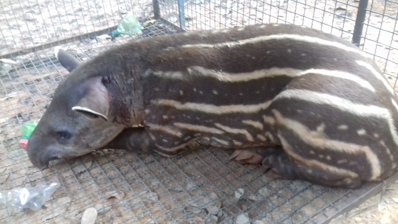 Campo Grande (MS) – Policiais Militares de Coxim foram acionados por um morador (31) de uma fazenda, localizada na altura do Km 820, no município de Sonora, a 10 km da cidade, para socorrer um filhote de anta (Tapirus terrestres) encontrado com vários