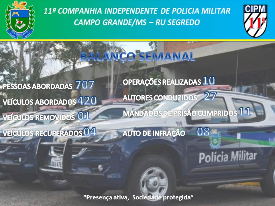 Campo Grande (MS) – Com a utilização da estatística criminal no planejamento das ações policiais, a 11.ª Companhia de Polícia Militar de Campo Grande/MS, apresenta os resultados das ações de combate à criminalidade, realizadas durante a semana de