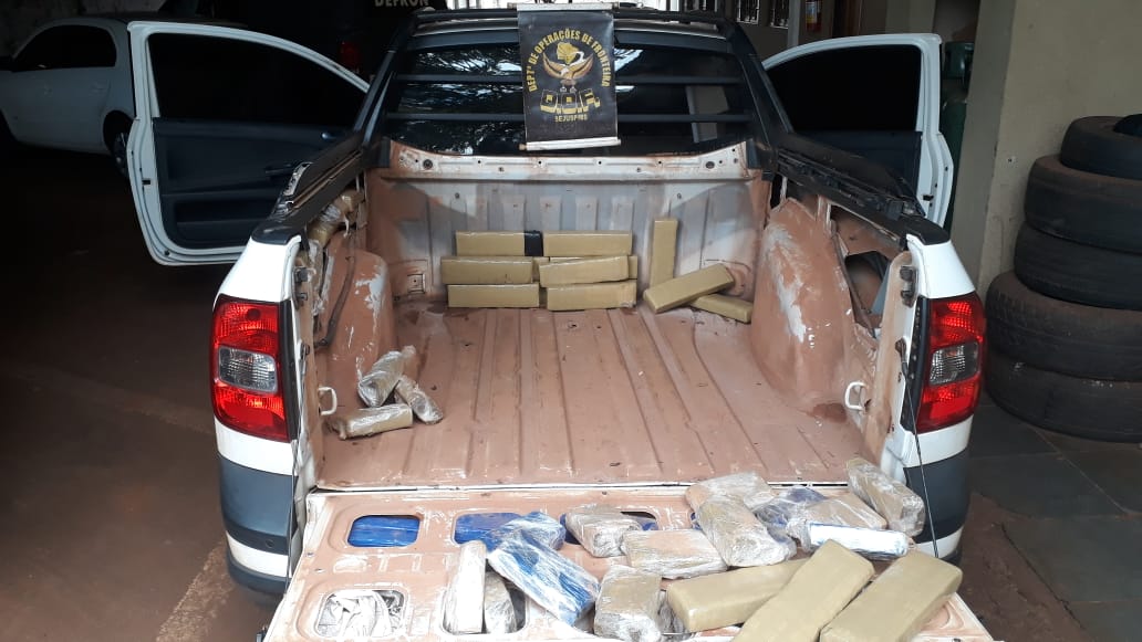 Ponta Porã (MS) – Policiais do Departamento de Operações de Fronteira (DOF) apreenderam na manhã deste sábado (23), por volta das 11h, um veículo VW Saveiro de cor branca, placas de Brasília (DF), carregada com 135 volumes prensados de uma