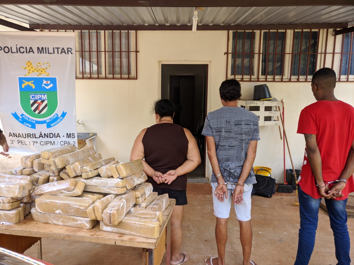 Anaurilândia (MS) – Na manhã de domingo (17.02), a guarnição da Polícia Militar em Anaurilândia, prendeu 03 (três) pessoas, sendo dois homens e uma mulher, que ocupavam um veículo transportando 119 tabletes de maconha. Os policiais realizavam