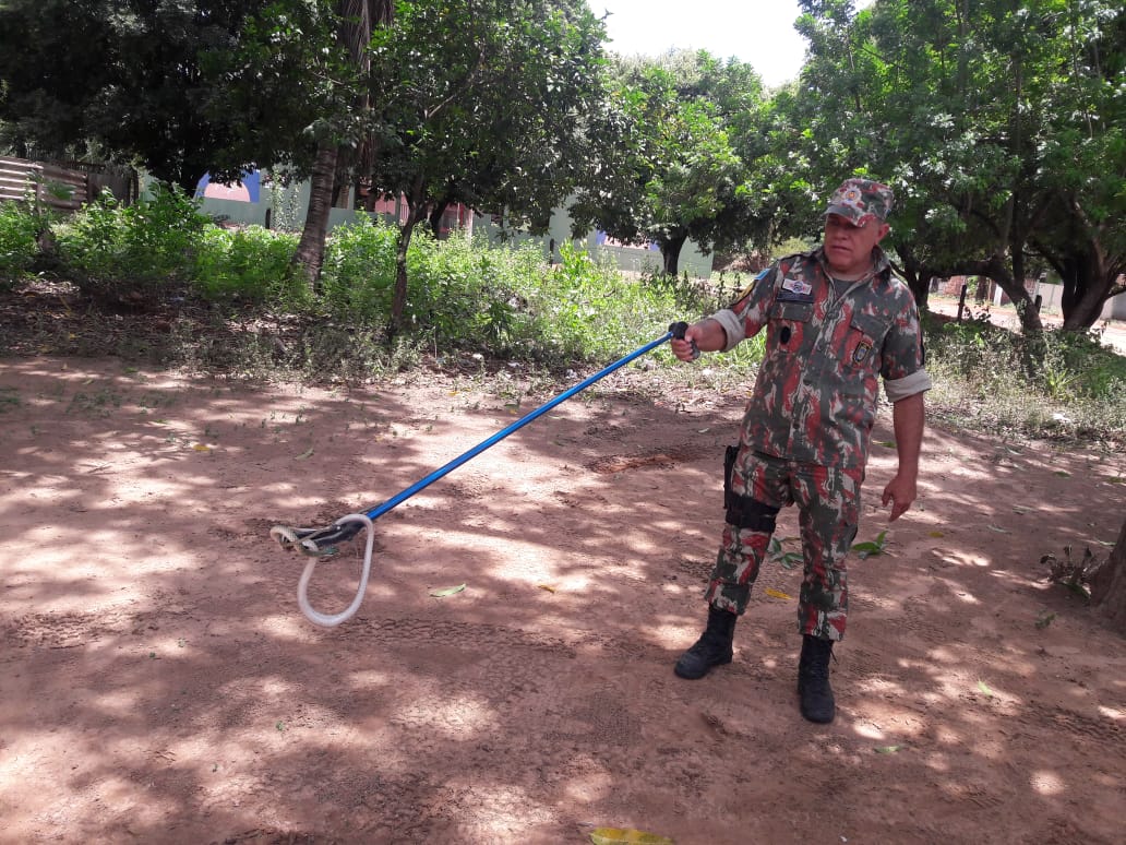 Campo Grande (MS) – Policiais Militares Ambientais de Coxim capturaram ontem (10) à tarde, uma serpente no quintal de uma residência no perímetro urbano. O proprietário acionou a PMA, quando avistara o animal em uma árvore próximo a sua casa. A