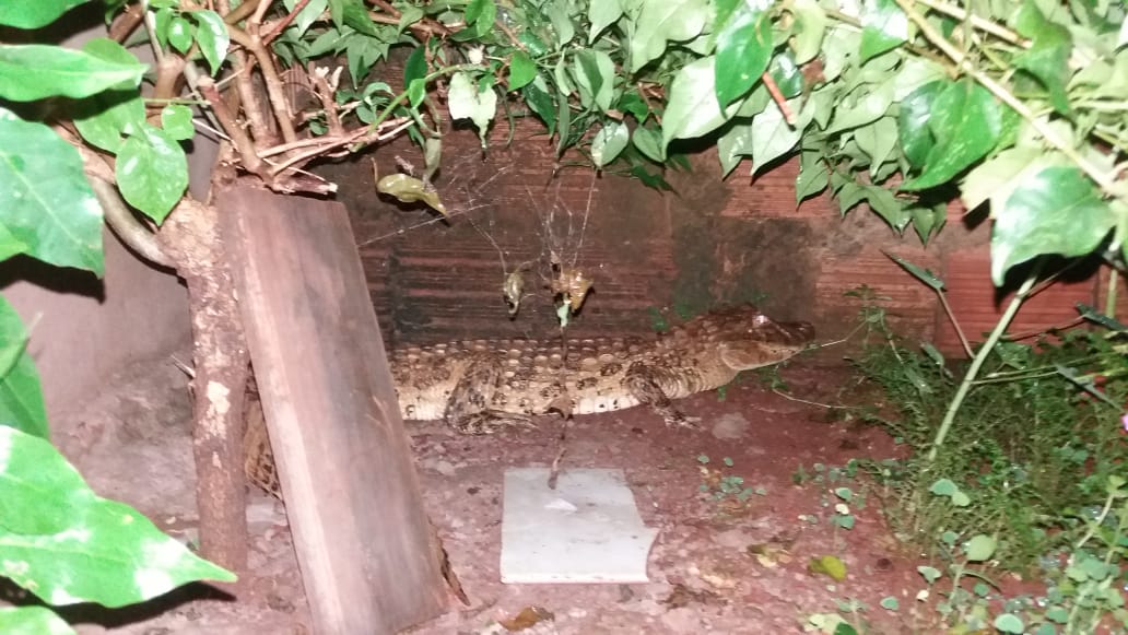 Campo Grande (MS) – Policiais Militares Ambientais da Capital foram acionados ontem (7) à noite para capturar um jacaré que estava no quintal de uma residência no centro da cidade de Terenos. Os policiais chegaram ao local e capturaram o jacaré que