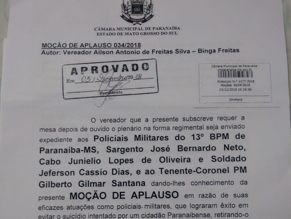 Paranaíba (MS) – No dia 03 de dezembro de 2018, policiais militares da equipe de Força Tática do 13º Batalhão de Polícia Militar, receberam uma moção de congratulações por terem salvado uma vítima de incêndio em residência. Proposta pelo