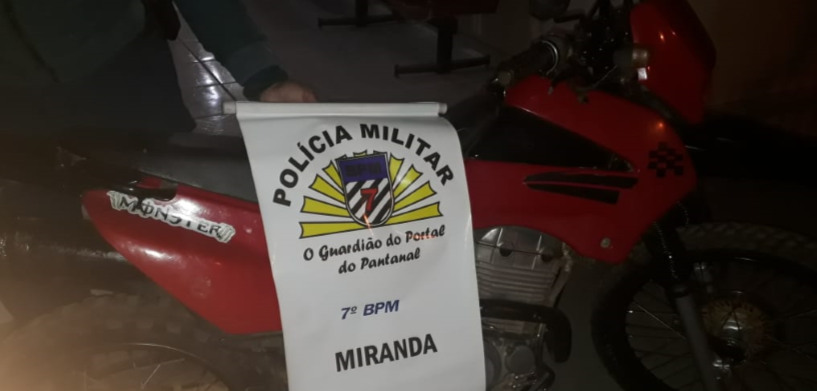 Aquidauana (MS) – Ontem (04.06), por volta das 21 horas, a equipe de Radiopatrulha do 7º Batalhão PM em Miranda recuperou uma motocicleta que, dias atrás, havia sido furtada. O veículo estava estacionado em frente a uma Conveniência de Bebidas