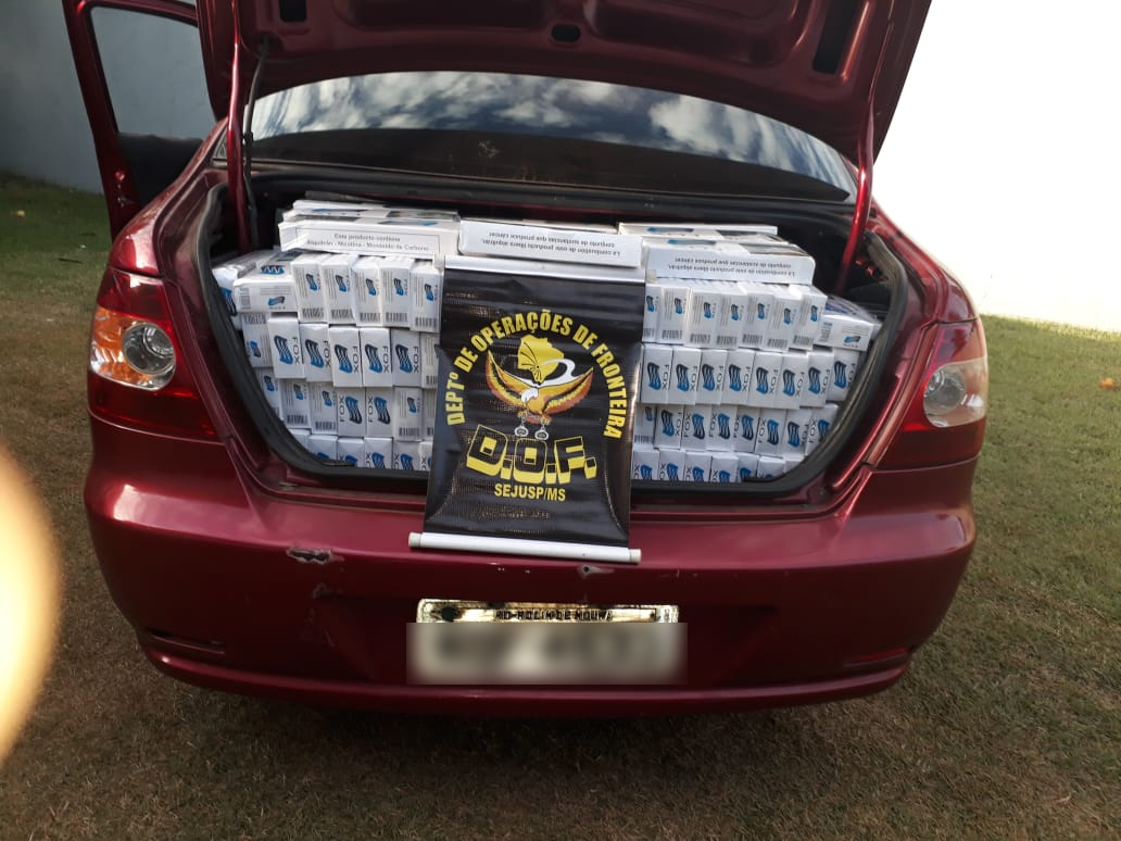 Maracaju (MS) – Policiais do Departamento de Operações de Fronteira (DOF) apreenderam na tarde de quarta-feira (23), por volta das 16h, um veículo Siena de cor vermelha e placas da cidade de Rolim de Moura, RO carregado com 1300 pacotes de cigarros, de