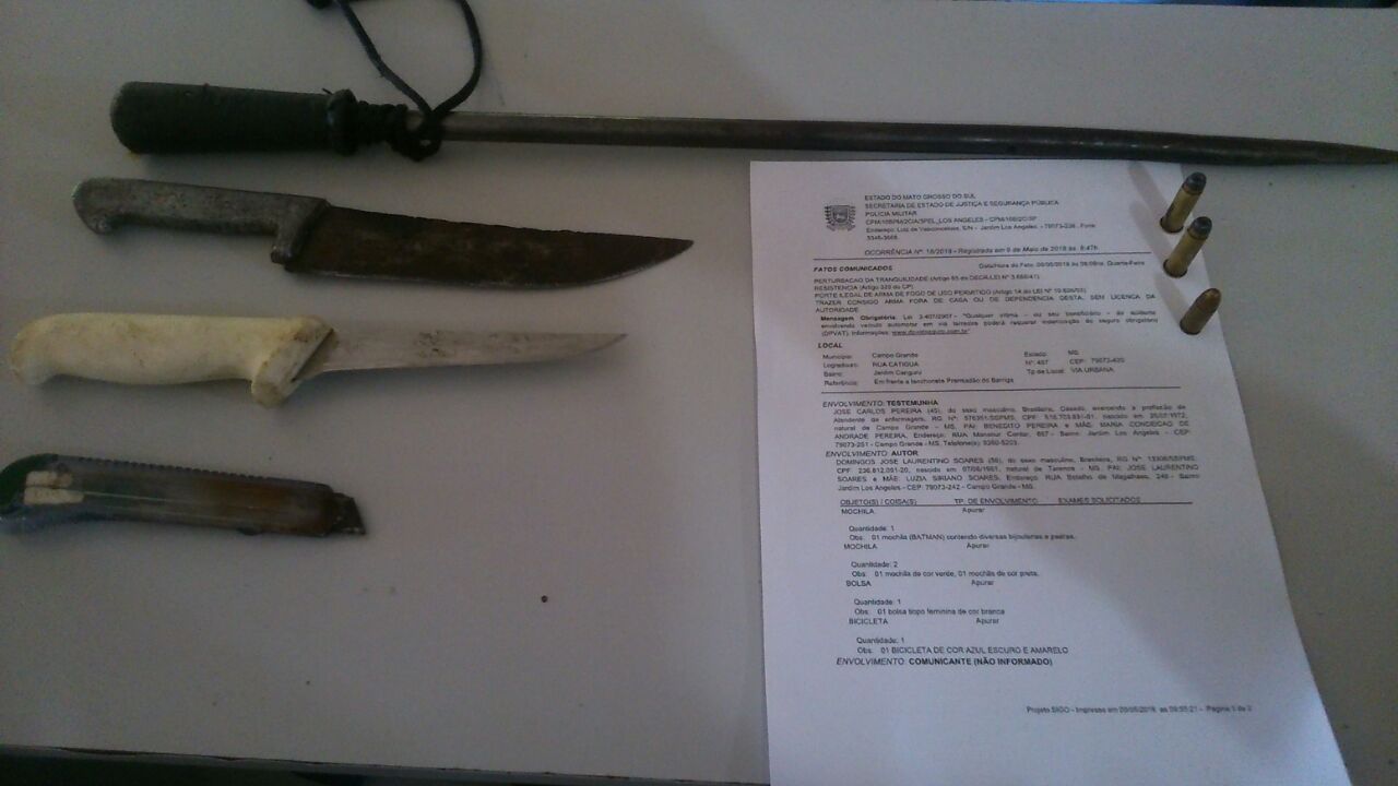Campo Grande (MS) – Policiamento Comunitário do bairro Los Angeles fez a prisão de homem portando uma arma branca semelhante a uma espada, ameaçando pessoas e também tentando destruir um telefone público no bairro Canguru. O autor encontrava-se