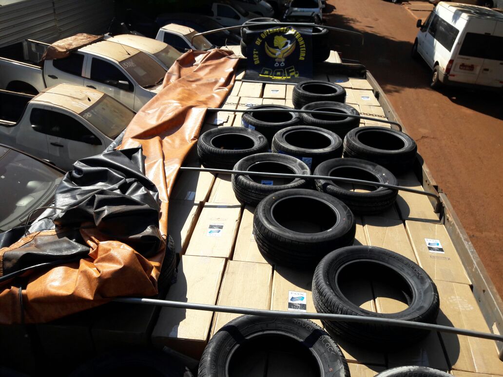 Dourados (MS) – Policiais do Departamento de Operações de Fronteira (DOF) apreenderam na manhã desta quinta-feira (26), por volta das 07h30, um caminhão Mercedes Benz de cor bege carregado com 15.000 pacotes de cigarros e 40 pneus novos de diversas