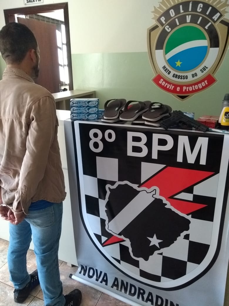 Nova Andradina-MS – No início da tarde de ontem (16), por volta das 12hs, a Central de Emergência da OPM recebeu uma informação de que um homem trajando uma jaqueta de cor cáqui havia adentrado em uma loja na área central da cidade, sacado uma arma de
