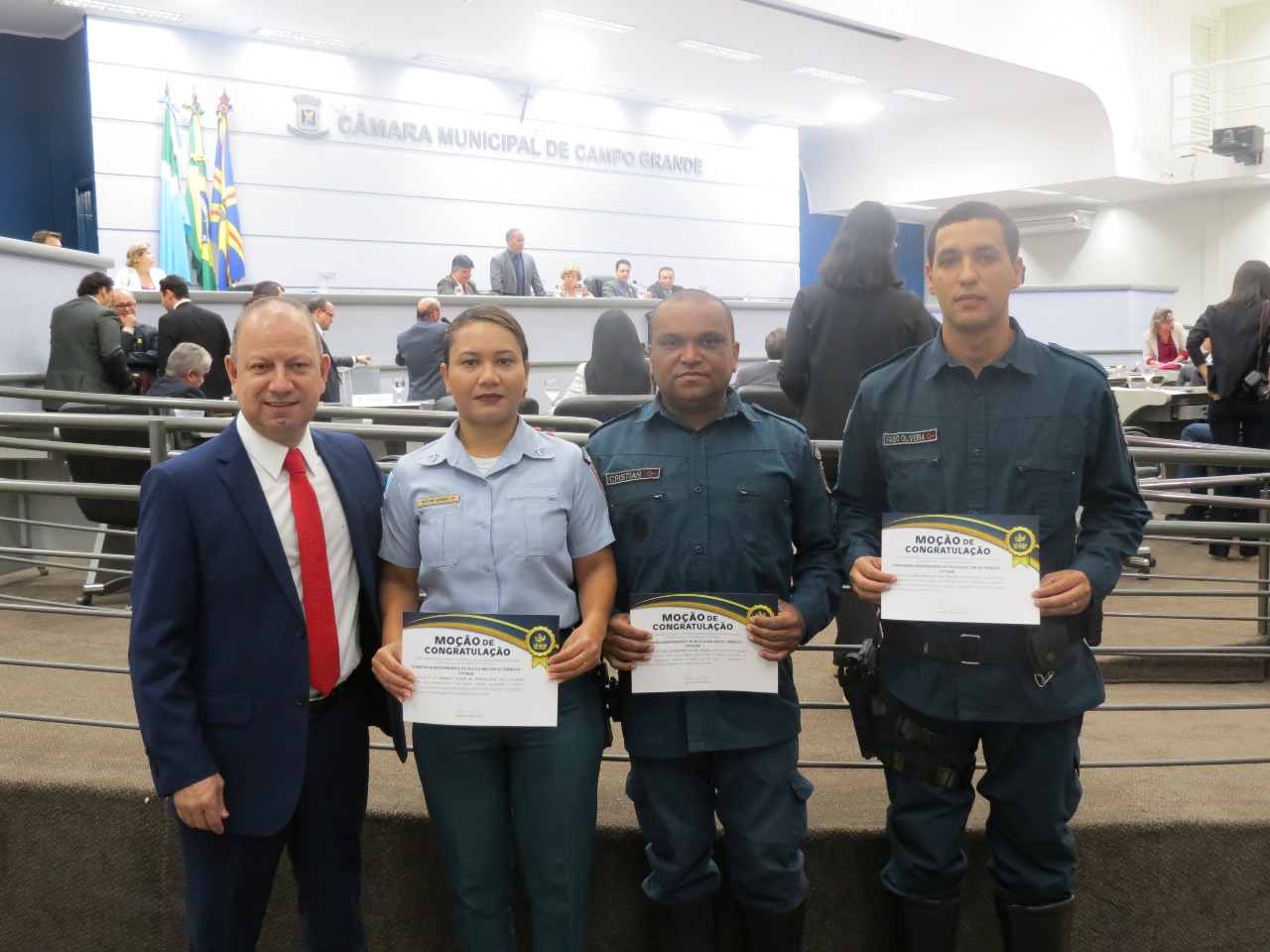 Campo Grande (MS) – A Câmara Municipal de Campo Grande homenageou, nesta quinta-feira (12), em sessão ordinária, os seguintes policiais militares do Batalhão de Polícia Militar de Trânsito – BPMTran: Cap. Willian Silva do Nascimento, Subcomandante