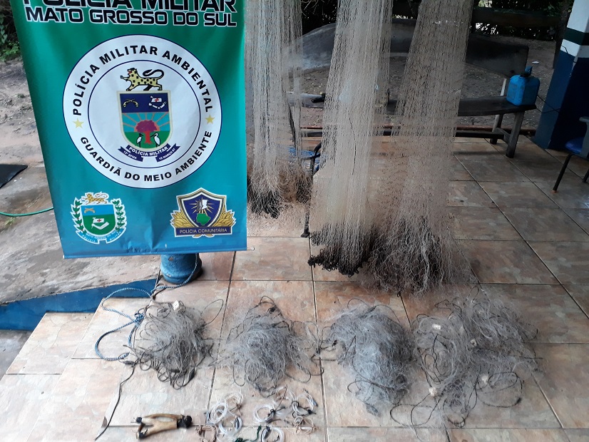 Campo Grande (MS) – Durante fiscalização fluvial no rio Aquidauna, entre o perímetro urbano de Anastácio até a região da fazenda Anhuma, na operação Semana Santa, Policiais Militares Ambientais de Aquidauana apreenderam diversos petrechos de pesca