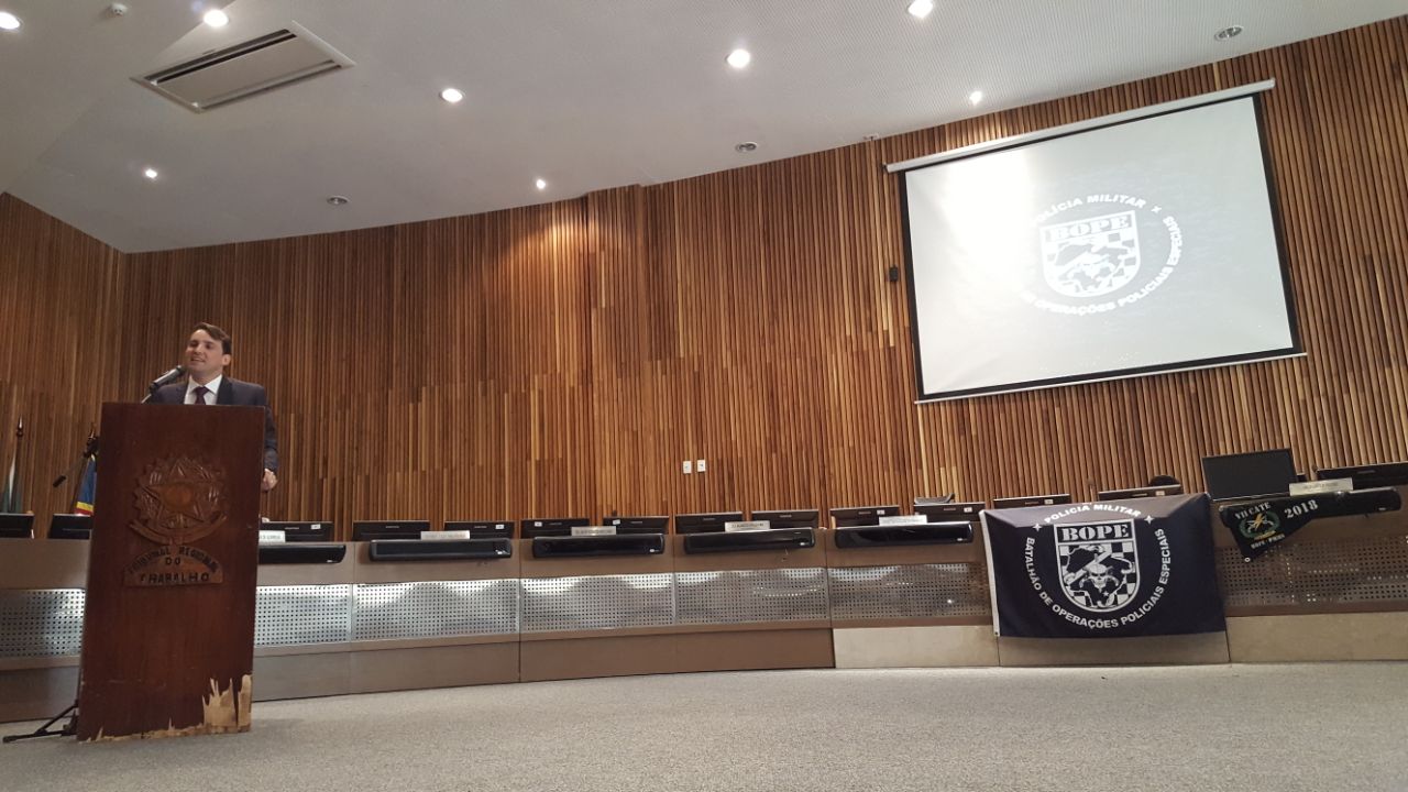 Campo Grande (MS) – O primeiro dia de aula dos alunos do VII Curso de Ações Táticas Especiais da Polícia Militar do Estado de Mato Grosso do Sul, ocorreu na tarde de hoje (28) no Plenário do Tribunal Regional do Trabalho com a presença de várias
