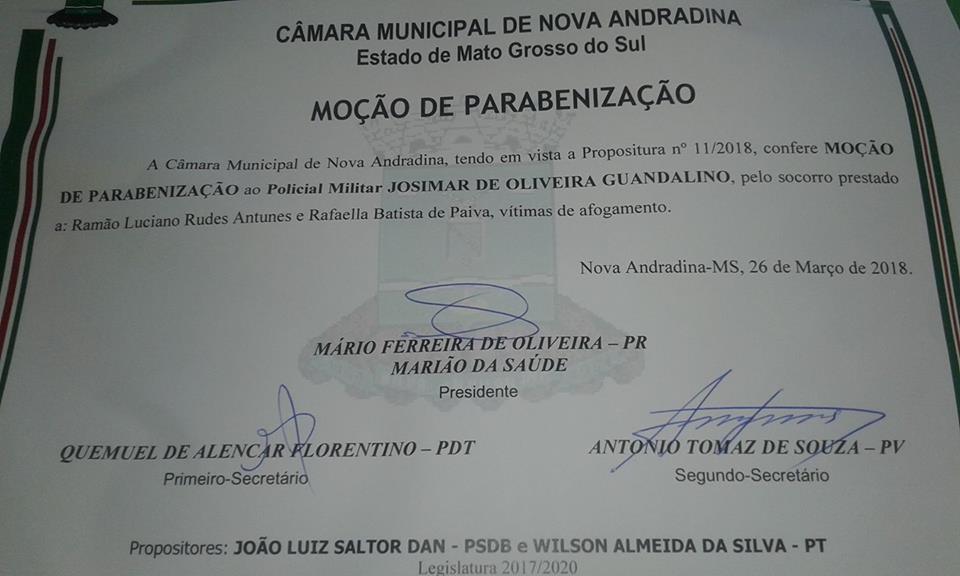 Nova Andradina (MS) – Na noite de ontem (26), o SD QPPM Josimar de Oliveira Guandalino, recebeu honrosamente através da Propositura nº 011/2018, de autoria dos Vereadores João Luiz Saltor Dan e Wilson Almeida da Silva, “Moção de Parabenização”
