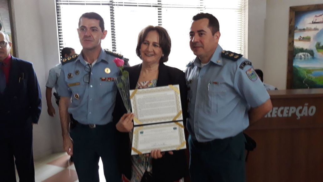 Três Lagoas (MS) – Nesta manhã (27/03/2018), a Policial Militar CB QPPM Elaine Cristina da Silva foi agraciada com o certificado de Policial Militar Destaque e a Sra. Conceição Maria de Lourdes Nere Palhares diretora da rede Feminina de Combate ao