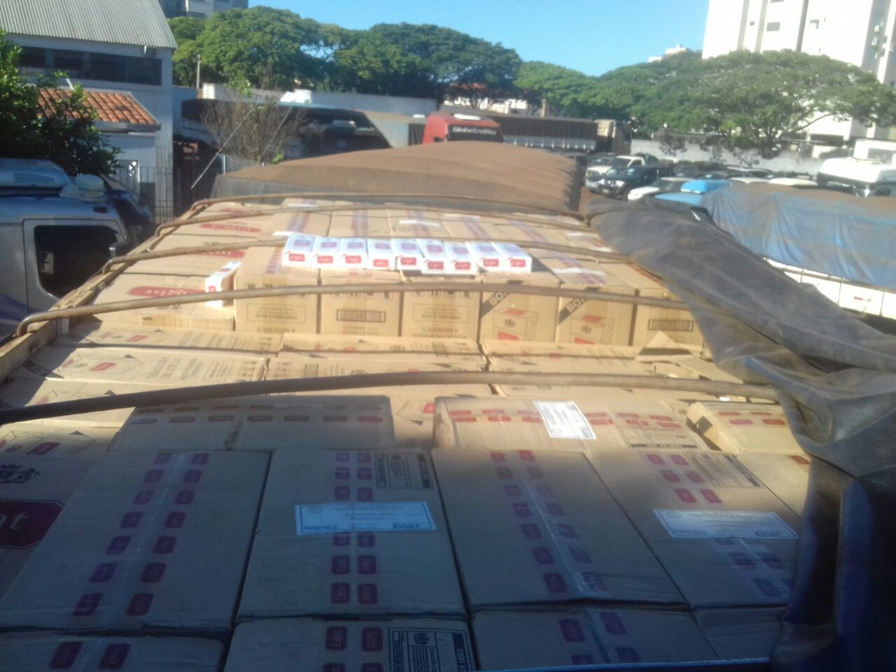 Maracaju (MS) – Policiais do Departamento de Operações de Fronteira (DOF) apreenderam na madrugada de segunda-feira (13), por volta das 4h30, dois caminhões trator acoplados a semirreboques transportando 90 mil pacotes de cigarros de origem estrangeira,
