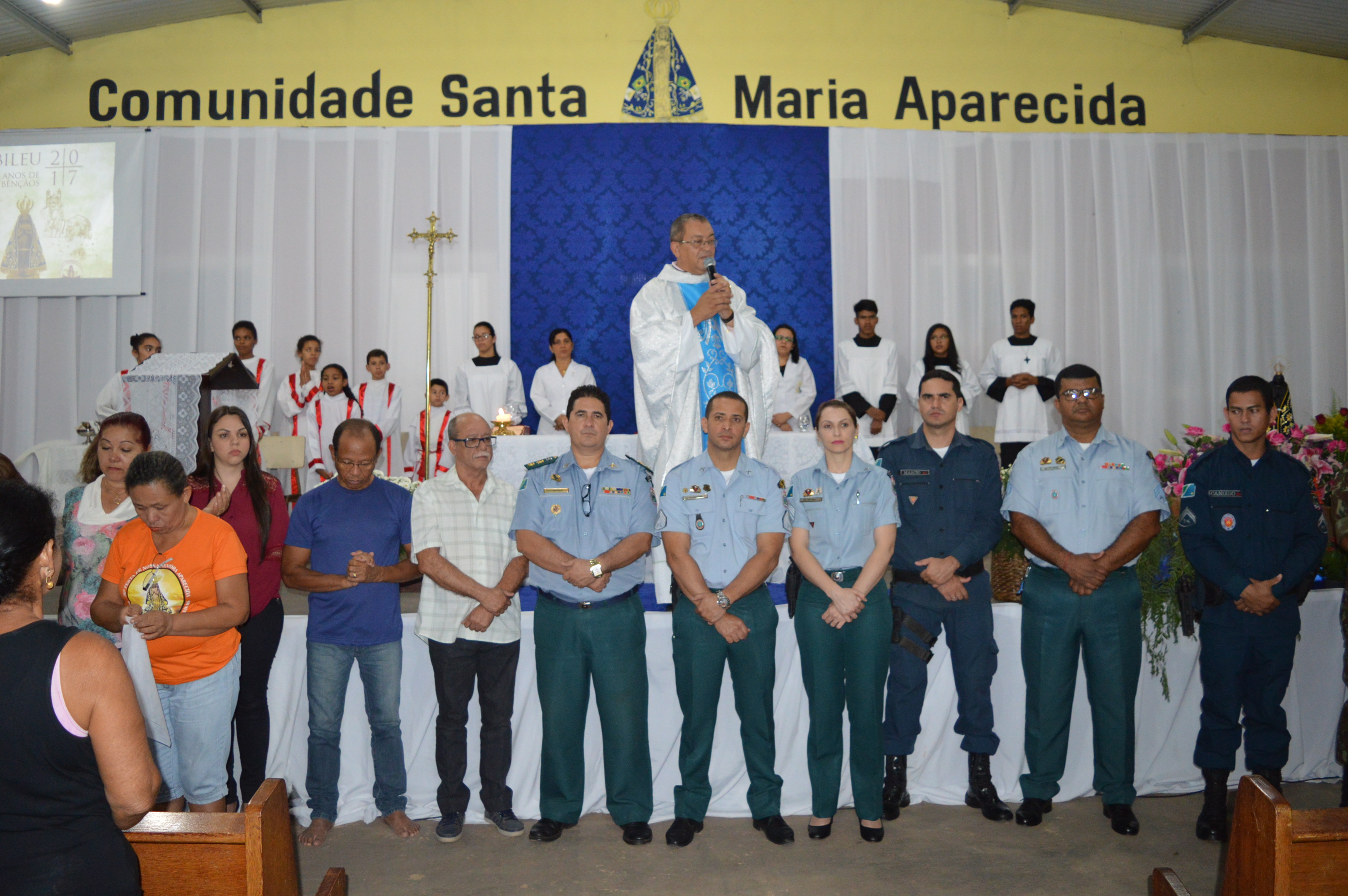 Coxim (MS) – Policiais Militares do 5º BPM, na noite de ontem (04) participaram da missa em comemoração aos 300 anos do encontro da imagem de Nossa Senhora Aparecida. A missa foi realizada na festa da comunidade Santa Maria do município em comemoração