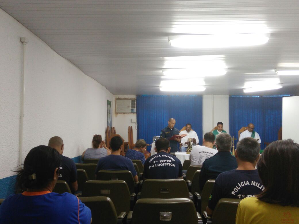 Campo Grande(MS) Nesta manhã de sexta-feira(22) Policiais Militares do 1ºBPM participaram de uma Missa no auditório do 1ºBatalhão de Policia Militar, o ato religioso foi ministrado pelo Capelão – Capitão Daniel do Exército Brasileiro, com o