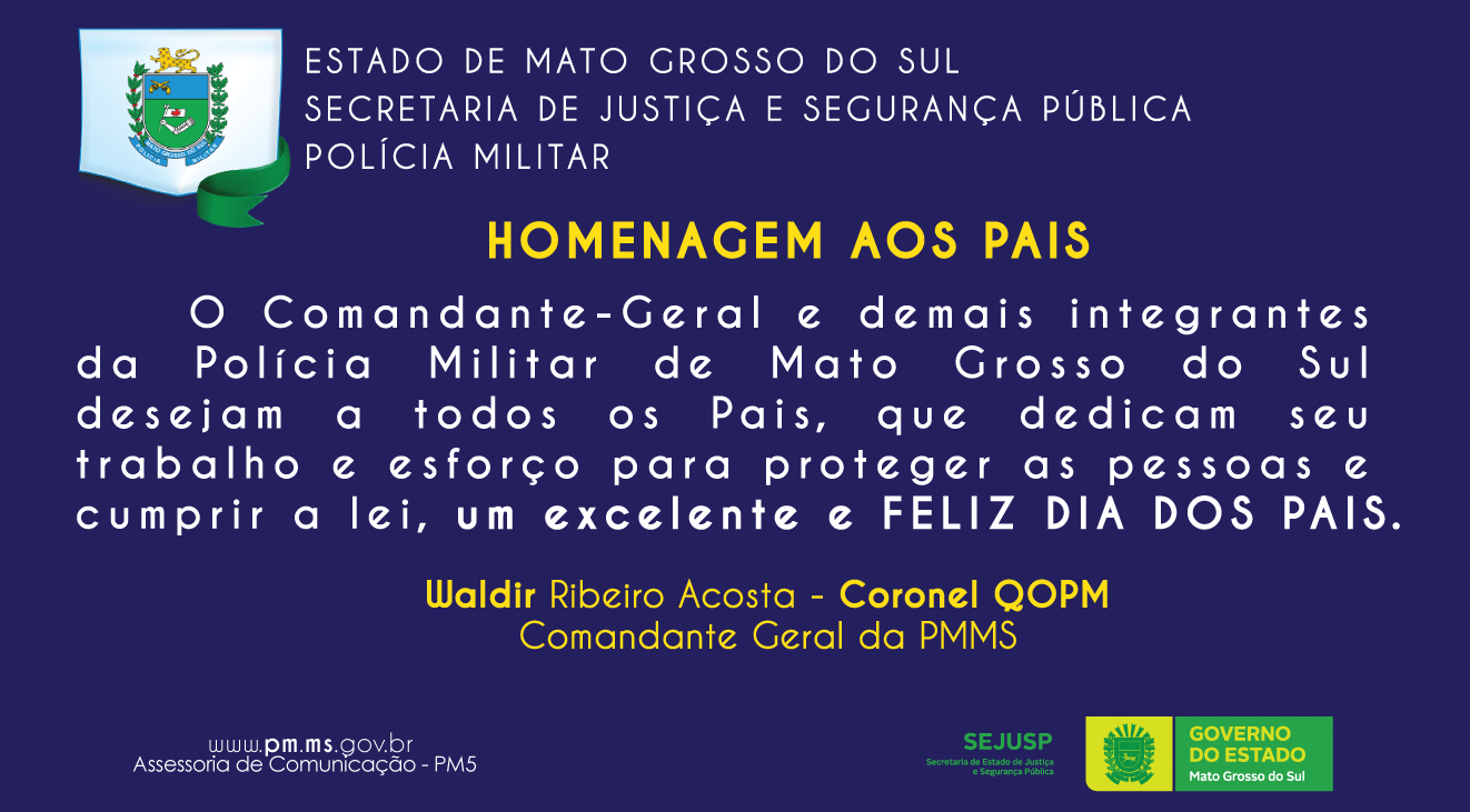 O Comandante-geral da Polícia Militar do Estado do Mato Grosso do Sul, coronel Waldir Ribeiro Acosta, parabeniza todos os pais policiais militares por esta data especial: “Ser pai é uma dádiva divina que nos engrandece. Pai policial militar, que Deus Pai