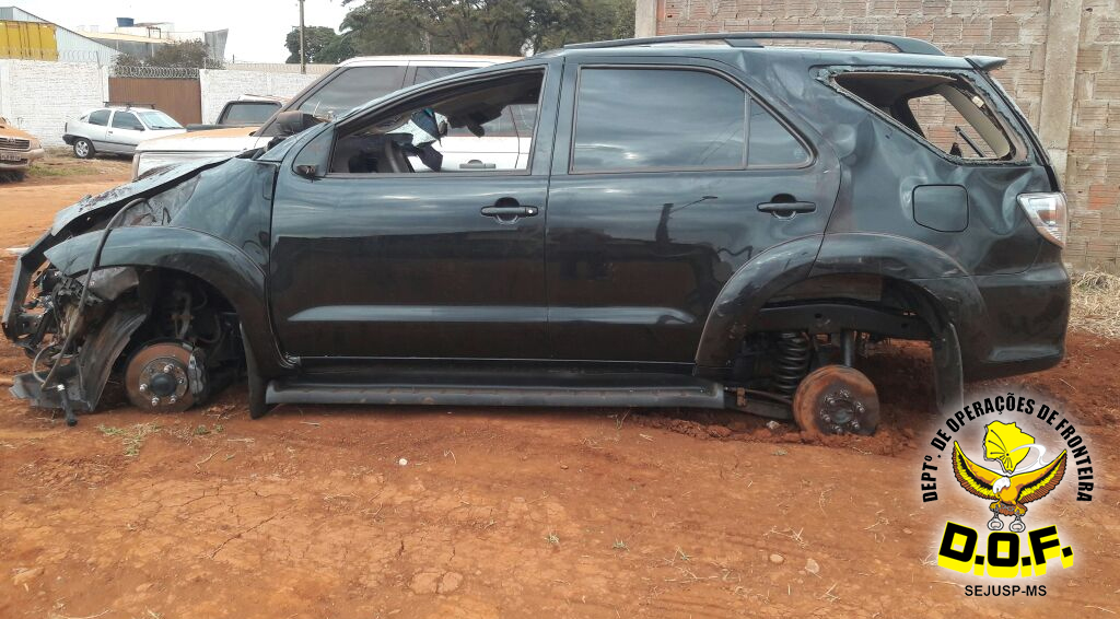 Laguna Carapã (MS) – Policiais do Departamento de Operações de Fronteira (DOF) localizaram na noite de terça-feira (1), por volta das 19h15, uma camioneta Toyota Hilux SW4, de cor preta e placas de Sobradinho, RS capotada e sem os quatro pneus. O