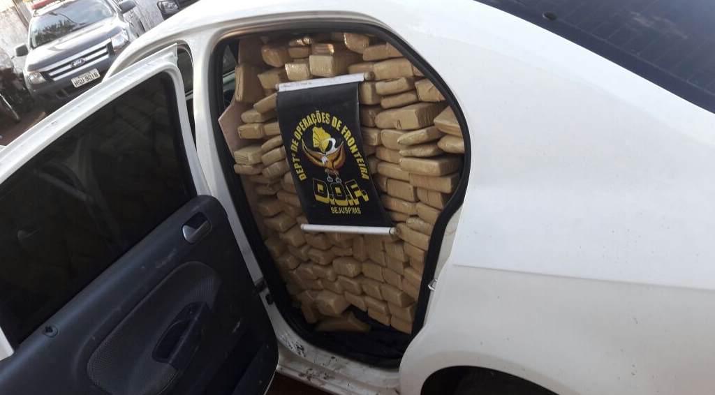 Dourados (MS) – Policiais do Departamento de Operações de Fronteira (DOF) apreenderam um veículo Voyage branco, com placas de São Paulo, SP carregado com 905 tabletes de uma substância aparentando ser maconha, com peso total de 909 quilos. A apreensão