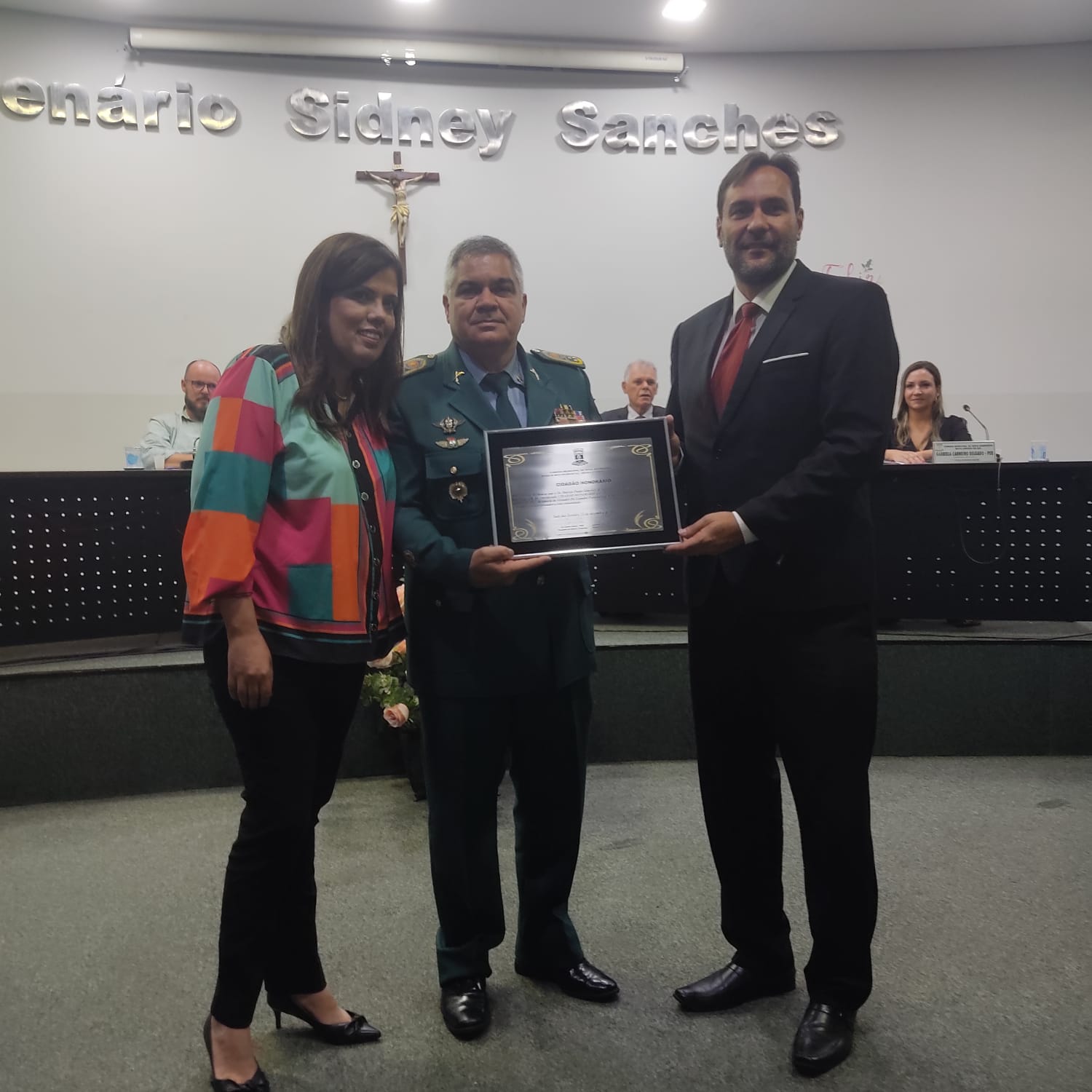 Nova Andradina (MS) – O Comandante Geral da Polícia Militar do Estado de Mato Grosso do Sul Coronel Marcos Paulo Gimenez recebeu na noite de terça-feira (13) das mãos do presidente da Câmara de Vereadores de Nova Andradina Dr. Leandro Fedossi, o título