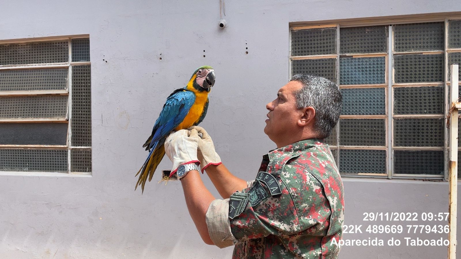 Campo Grande (MS) – Policiais Militares Ambientais de Aparecida do Taboado capturaram hoje (29) às 8h30, uma arara-canindé em uma residência no centro da cidade. Um morador ligou para a PMA informando que o animal apareceu no quintal de sua