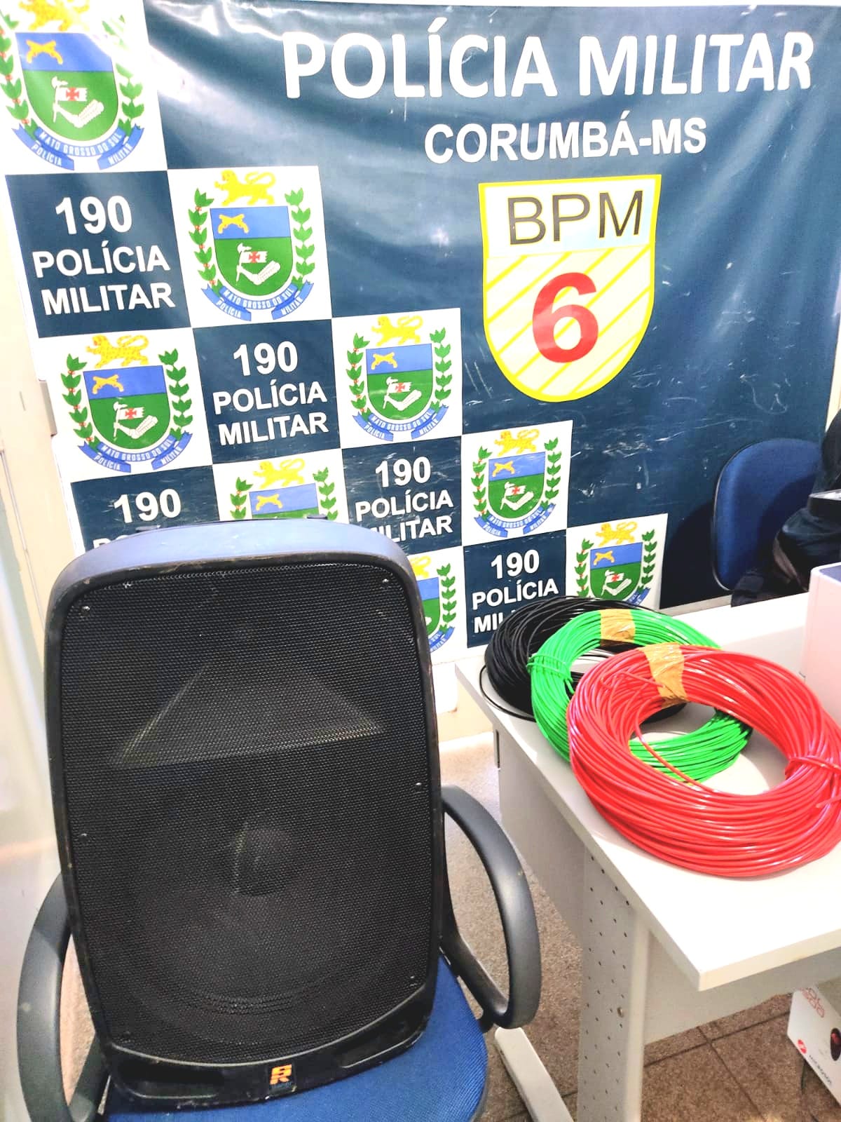 Corumbá (MS), nesta tarde a equipe do Trânsito foi acionada para verificar indivíduos suspeitos na Alameda Santa Rosa, Centro América. No local foram encontrados três rolos de fios de elétricos e uma caixa de som, dentro de um saco preto, abandonados